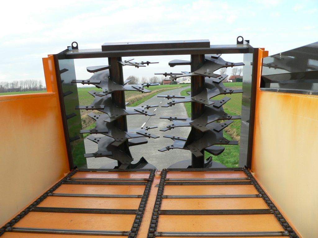 De mest die door de bovenste wals naar voren wordt geslingerd, wordt door een beschermplaat tegen gehouden en valt weer in de laadbak. Het verhoogde kopschot biedt extra bescherming voor de cabine.